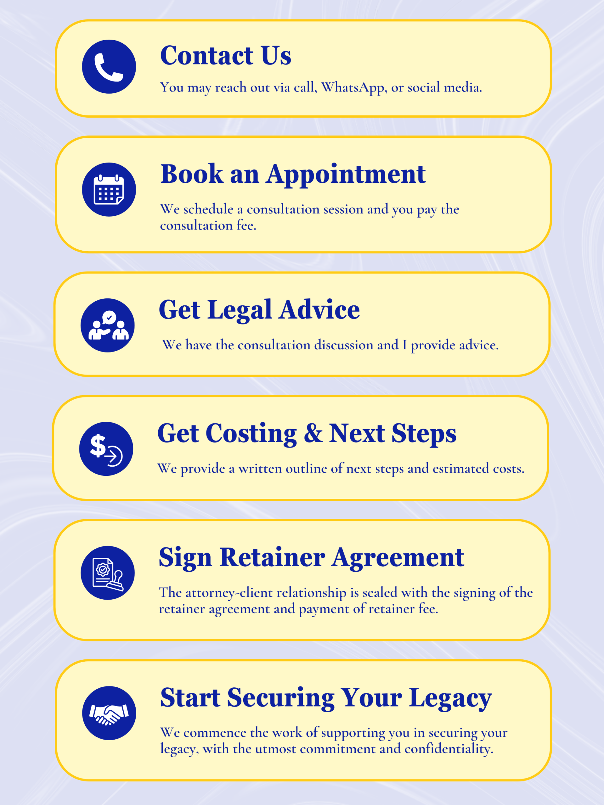 We believe legal services should be straightforward and stress-free. Whether you’re abroad or right here in Jamaica, our process is designed to guide you from start to finish with clarity and care. From your first inquiry to final results, here’s how we help you move forward — one trusted step at a time.